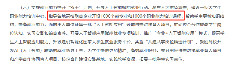 教育部日前印发通知,部署实施高校学生就业能力提升“双千”计划,推动全国范围内开设1000个“微专业”(或专业课程群)和1000个职业能力培训课程。