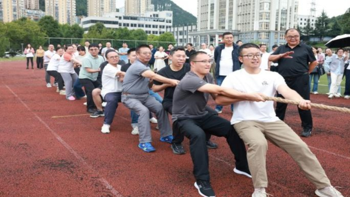 为庆祝第41个教师节,丰富教职工文化生活,9月10日下午,学校在田径场举行教职工拔河比赛。本次比赛共吸引了16支队伍参赛。