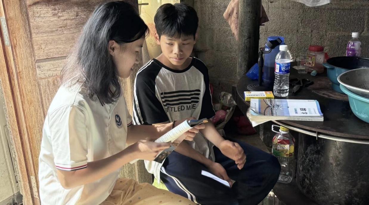 实践期间,团队将工作重心置于留守儿童安全教育与学业帮扶上。考虑到部分孩子居住地离村委较远,团队主动联系村支书和干部,进行走访辅导。在一户人家,队员遇见暑期后升初二的留守男孩,孩子正认真洗碗,交流中得知其英语单词背记困难、数学几何理解不清。队员们当即结合学科特点和自身专业优势,传授音标记忆法突破英语词汇瓶颈,拆解几何图形、巧用辅助线等方法梳理数学解题思路。期间与男孩着重讲解了学习方法。离开时,队员为孩子送上精心准备的水性笔、笔记本等文具,鼓励他保持学习热情。