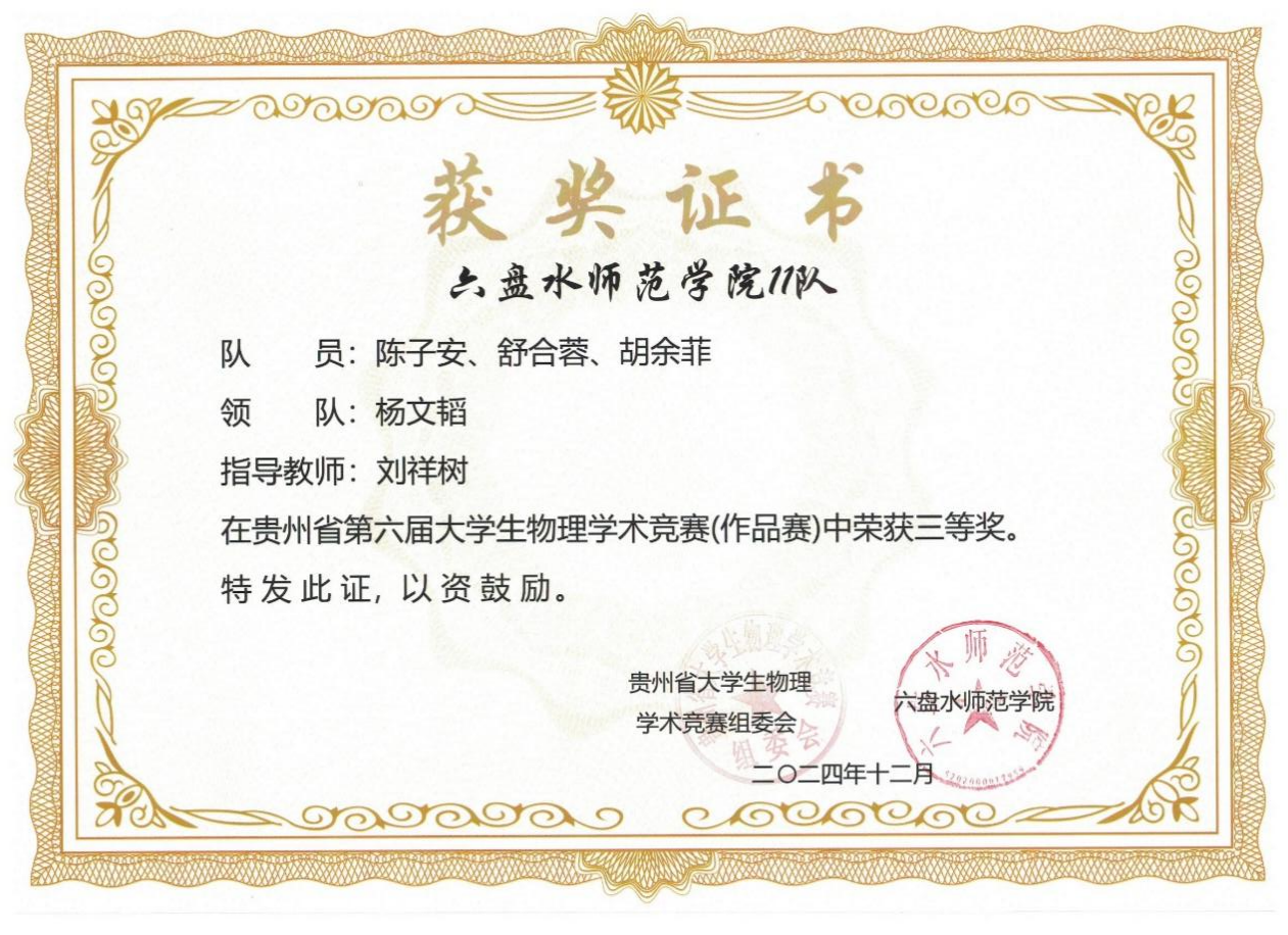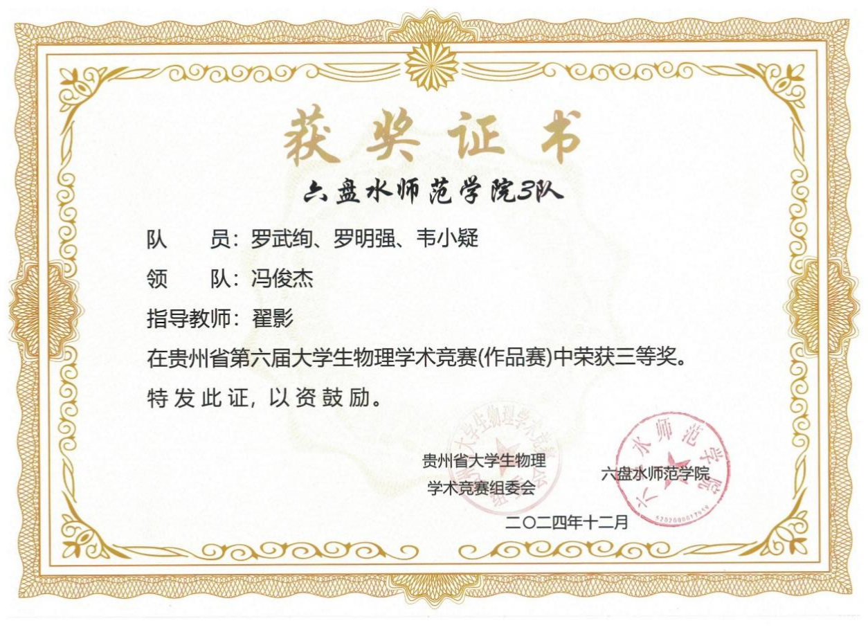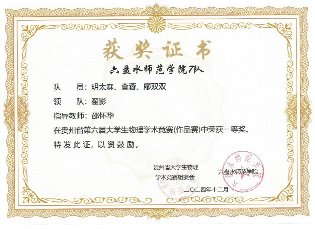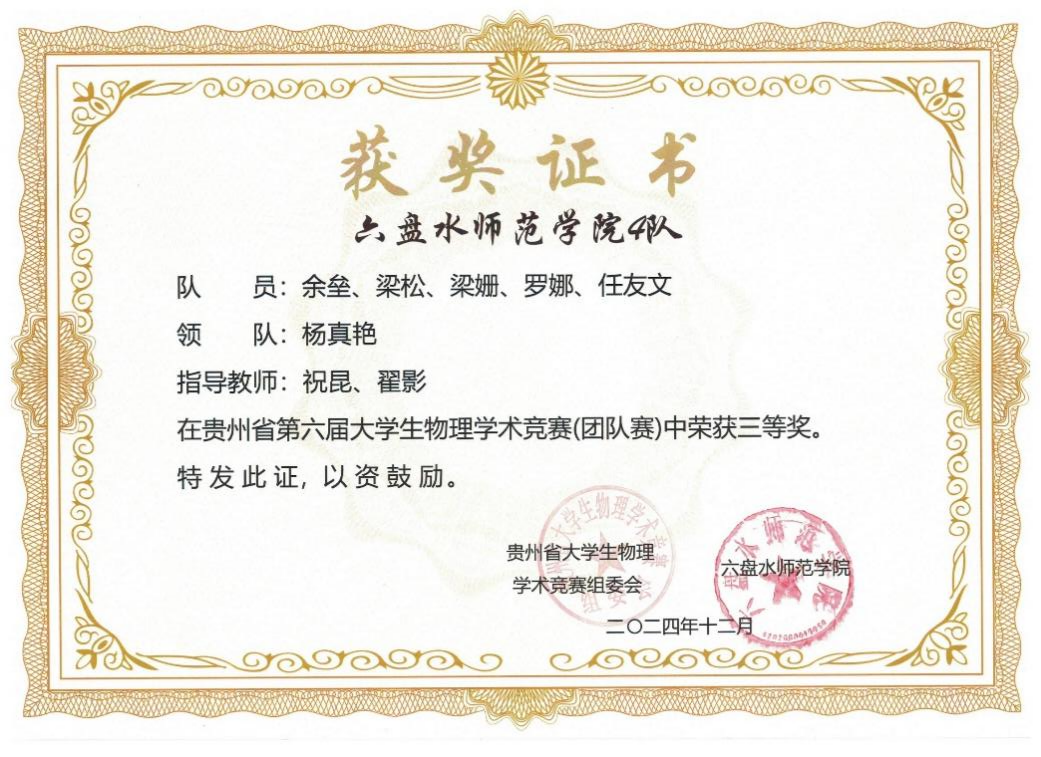 2024年11月30日,第六届贵州省大学生物理学术竞赛(GZUPT)决赛在我校举行,此次GZUPT竞赛分为团队赛和作品赛两个赛道,共有来自省内13所高校参加,报名参赛人数达842人。我院12支团队赛队伍和12支作品赛队伍代表学校参加两个赛道的比赛。经过初赛,6支团队赛队伍获得团队赛道优胜队伍,7支作品赛队伍获得作品赛道优胜队伍,两支团队赛队伍和两支作品赛队伍进入决赛,并在决赛中表现亮眼,最终全部获得一等奖。此外,还有4支团队赛队伍、5支作品赛队伍获得三等奖,周欣同学获得最佳反方奖,罗明雪同学获得最佳评论方奖,这是自我校参加该项赛事以来取得成绩最好的一次,为应用物理学一流专业建设奠定了基础,支撑了物理学学科建设。