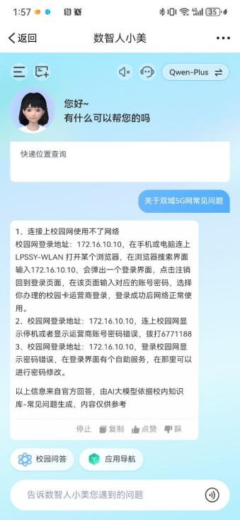 1.网页端访问:登录“六盘水天辰娱乐融合门户”(https://portal.lpssy.edu.cn),点击首页中“数智人小美”浮标,即可体验校园专属AI服务。